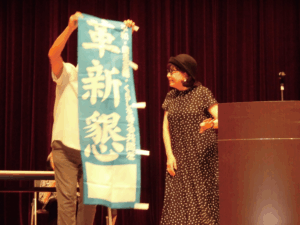 大阪革新懇を代表して祝辞を述べた藤永延代代表世話人は「維新は生き残りをかけて都構想3度目の住民投票をやろうとしています。今度は副首都をエサにやる。負けるわけにはいかない。『学び、伝え、行動する市民力』が大切だと思う。それが革新懇です。連帯のお祝いとして旗を持ってきました。」と述べて、城東革新懇に活動再開記念ののぼりを贈呈しました。