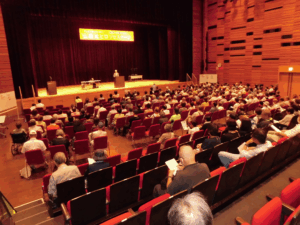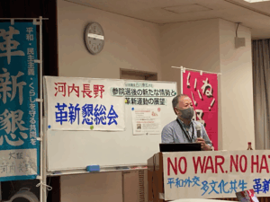 結果の分析、参政党伸長の背景などを解明し、「敵視でなく、ともに考える姿勢を」と熱く訴え。「選挙結果のモヤモヤがスッキリした」「政治を模索する若者の中にある大きな可能性を再認識した」などの感想が寄せられました。総会では240人を超える参加で成功した河内長野平和フェスタなど一年間の共同の取り組みを振り返り、各分野の取り組みを一層発展させようと提案。高校つぶし反対や私学助成の運動などの発言が続きました。