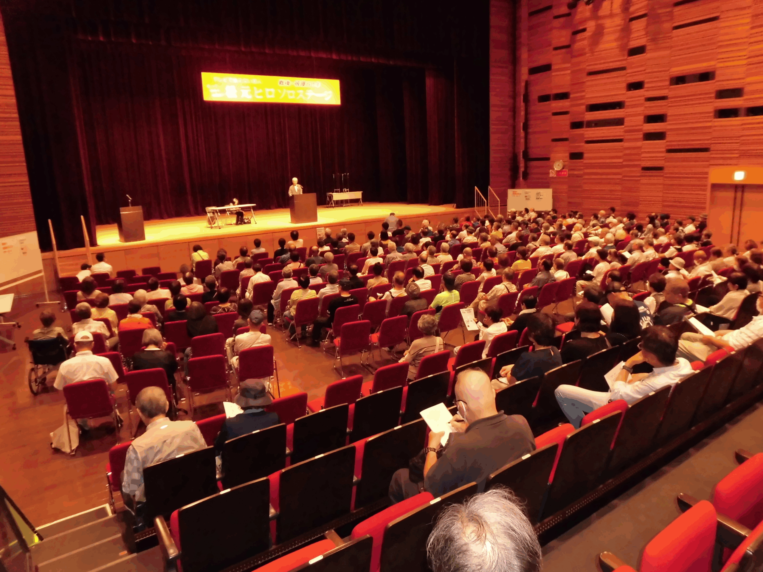 9月27日、城東区区民センター2階ホールにおいて城東革新懇主催の集会が開催されました。集会の第一部では式典として「革新懇再始動アピール」、「戦後80年に語る」が行われ、第2部では松元ヒロさんのソロステージが行われました。