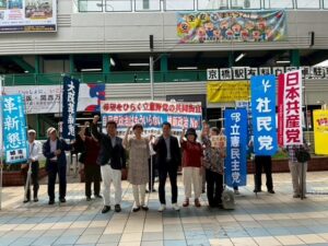 員は「失われた30年は26年続いた自公政権がつくったもの。野党が一致するところで団結して、自民党政治を終わらせよう」社民党のながさき由美子府連代表は「秋になって物価値上げが続いている。自民党の無策だ。同時にスパイ防止法を叫ぶ勢力がいる。私の家族も治安維持法で犠牲になった。こんな法律を作ってはならない」最後に二木洋子高槻・島本市民連合よびかけ人が「総裁選や政権枠づくりで国会が開かれず物価高対策などが遅れている。野党共闘は確実に成果を上げて自公政権を少数に追いやった。さらに強めよう」と訴えました。この宣伝には再起動した城東革新懇から9名参加し、50名超の集まり、多くの人が立ち止まり聞き入っていました。
