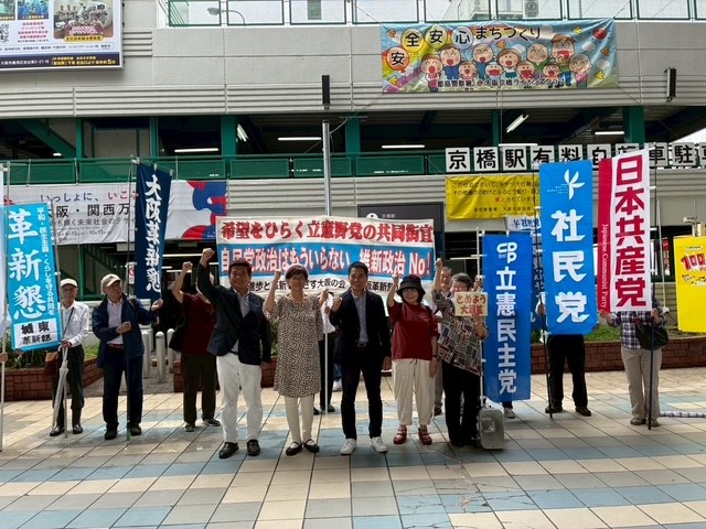10月10日の公明党の政権離脱は激震が走りました。その直後、12日に大阪革新懇による「希望をひらく立憲野党の共同街宣―自民党政治はもういらない、維新政治NO!」を京橋で行い、立憲民主党、日本共産党、社会民主党が参加。「高槻・島本市民連合」からもスピーチをいただきました。冒頭、藤永延代代表世話人が「ここは京橋大空襲で600人以上の犠牲者が出た。絶対に戦争する国にしてはならない。共闘の力で国民が輝く新しい時代をつくろうと」呼びかけました。立憲民主党の森山ひろゆき衆議院議員は「政治と金で国民は怒っている。まずは政治改革やるために野党が団結する。16年ぶりのこのチャンスを国民のためにものにしたい。」日本共産党のたつみコータロー衆議院議 員は「失われた30年は26年続いた自公政権がつくったもの。野党が一致するところで団結して、自民党政治を終わらせよう」社民党のながさき由美子府連代表は「秋になって物価値上げが続いている。自民党の無策だ。同時にスパイ防止法を叫ぶ勢力がいる。私の家族も治安維持法で犠牲になった。こんな法律を作ってはならない」最後に二木洋子高槻・島本市民連合よびかけ人が「総裁選や政権枠づくりで国会が開かれず物価高対策などが遅れている。野党共闘は確実に成果を上げて自公政権を少数に追いやった。さらに強めよう」と訴えました。この宣伝には再起動した城東革新懇から9名参加し、50名超の集まり、多くの人が立ち止まり聞き入っていました。