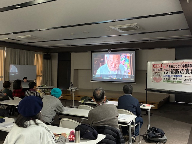 そして「旧日本軍731部隊の真実〜元少年隊員の731部隊跡訪問」と題する原文夫さんの講演。原さんは、731部隊少年隊員だった清水英男さんが、昨年8月に中国・ハルピン近郊にある旧日本軍731部隊跡と罪証陳列館(博物館)を訪れ、犠牲者への謝罪と鎮魂の思いを伝えた旅に同行しました。その様子を紹介しながら、「旧日本軍731部隊」とはなんだったのか、設立の経緯、部隊の概要や編制、人体実験や生体実験、細菌兵器使用など、その実態を生々しく告発しました。日本国内では不可能な「医学犯罪」ですが、731部隊のエリート医学者には得難い「研究の場」になっていたという、倫理観をなくした非人道的な医学者の姿に怒りも。しかも、医学戦争犯罪を免責し、医学者たちは自己批判することもなく戦後の医学界で重要なポジションを占めていったとか。また先人たちが犯したホローコストの忌まわしい歴史に真摯に向き合い学ぶことに努めているドイツと比較して、過去に日本が行った他国への侵略、加害の史実に関する日本政府の姿勢は、「過去に目を閉ざす」ものではないかと厳しく糾弾!