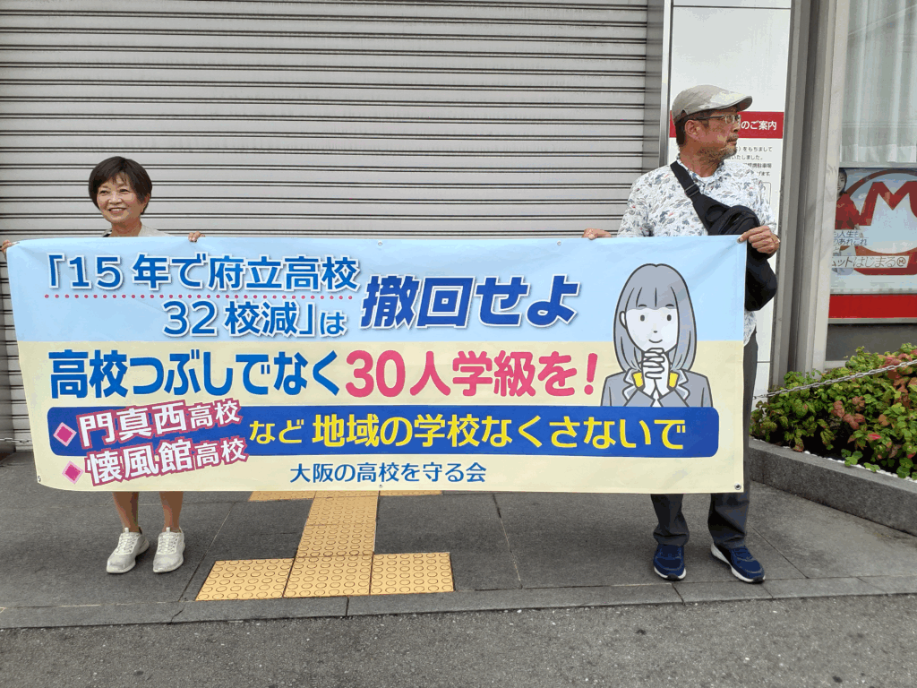 9月13日(土)に、藤井寺駅前にて、「大阪の高校を守る会」の呼びかけで、「懐風館高校の募集停止案の撤回を求める」署名・宣伝行動を行いました。